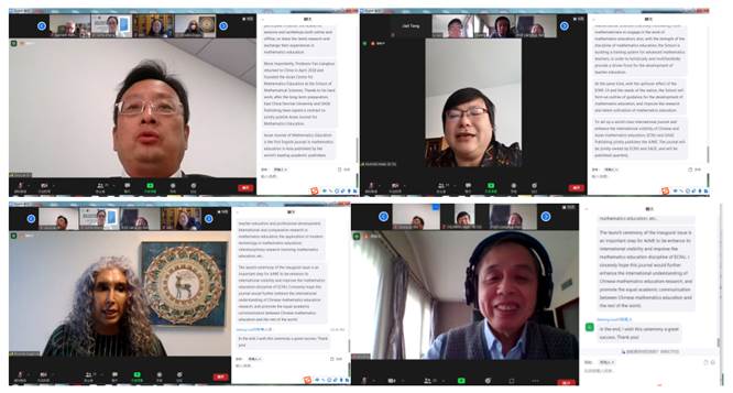 接着,Rosalia da Garcia女士介绍了期刊与SAGE合作的创刊历程,表达了对本刊创刊及双方合作的美好祝福;王建磐教授进一步介绍了有关期刊的创办、筹建工作;期刊编辑李淑惠博士宣读了本刊荣誉主编英国南安普敦大学Geoffrey Howson教授发来的贺词;綦春霞教授介绍了本刊创刊的初衷和期刊的使命;Kenneth Ruthven教授和马欣教授分享了作为首刊作者的感受;Christian Bokhove、Yoshinori Shimizu和Gabriele Kaiser教授也分享了自己的感受和对期刊的祝贺。此外,期刊编委会多位成员包括弗赖登塔尔奖获得者、巴西里约热内卢联邦大学Gert Schubring教授,原国际数学教育委员会主席、弗赖登塔尔奖获得者、南非威特沃特斯兰德大学Jill Adler教授,以色列海法大学教育学院院长Roza Leikin教授等都特地对首刊出版表示了书面祝贺,并对刊物的未来发展表达了良好的祝愿。与会嘉宾及学者们也表达了对主编、各位编者的感谢和本刊的美好期待。