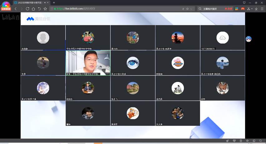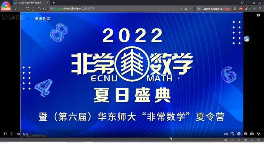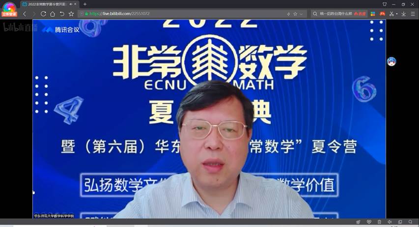 8月11日,由华东师大成人视频 、上海市核心数学与实践重点实验室、上海市数学会主办,五峰土家族自治县人民政府、52数学网协办的2022非常数学夏日盛典暨第六届华东师大非常数学夏令营在线开幕。华东师大成人视频 院长吕长虹,中国科学院院士、中国数学会理事长兼中国数学会数学教育分会理事长田刚,上海市数学会秘书长姚一隽,上海市核心数学与实践重点实验室主任、成人视频 教授熊斌致开幕辞。开幕式由华东师大成人视频 党委书记贾挚主持。