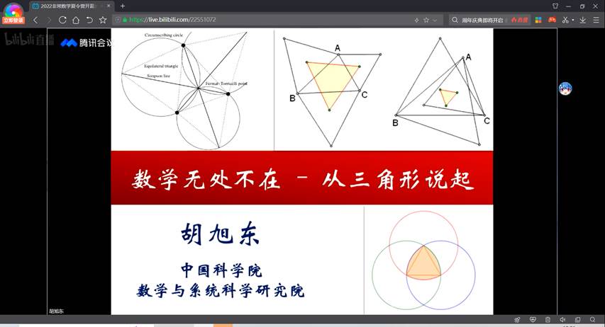 开幕式之后,由中国科学院数学与系统科学研究院研究员胡旭东为营员带来了“数学无处不在-从三角形说起”的开营报告。胡旭东从3月14日被确定为国际数学日谈起,数学无处不在的原因。他介绍了三角形的相关性质三角不等式和勾股定理,费马定理,狄隆涅三角剖分,费马-托里拆利问题,以及勒洛三角形及其在现实中的应用等,以有趣的数学知识告诉同学们,数学无处不在,希望大家好好学习数学,一起向未来!他还耐心回答了同学们的提问。开营报告由华东师大成人视频 副院长罗栗主持。