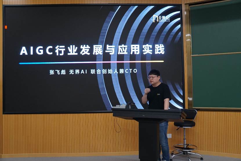 随后,张飞彪为新生做《AIGC行业发展与应用实践》主题报告。张飞彪2010年毕业于华东师大原数学系,目前任无界AI 联合创始人兼CTO,主要负责无界AI和矩池云业务,以及产品、设计、研发、算法等团队。他有十多年软件研发和技术管理经验,是AI领域资深技术专家,曾任字节跳动和小红书技术总监,技术委员会和晋升委员会委员,多次受邀作为QCon/SECon全球软件开发大会、ArchSummit全球架构师峰会、稀土开发者大会的专题出品人和技术顾问。他深入浅出地介绍了AIGC的概念定义、技术框架、行业发展、应用实践等,为同学们做了一次全面的AIGC行业知识普及。
