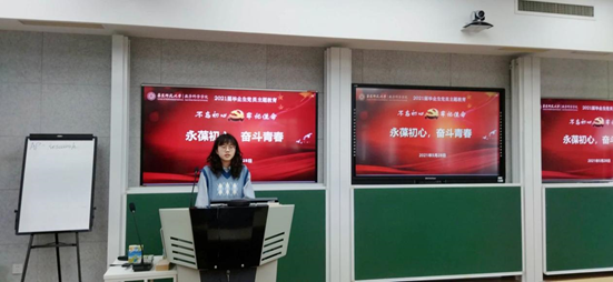 会议伊始,学院党委书记贾挚以《了解红史绿城,学史悟思、知史奋进》为题,围绕红史绿城、遵义会议、学科往事、使命担当四个部分为毕业生党员上了一堂生动的党课。她指出,青年人在不同的年代,承担着不同的历史使命,如何将自我融入到国家的发展和民族的振兴中,是每位新时代青年应该深入思考的问题。她勉励全体毕业生党员,一是在中国共产党百年华诞的重大时刻和“两个一百年”历史交汇的关键节点,要牢记党员身份,认真学习党史,从党史学习中汲取前进动力,让初心融入血脉,将使命扛在肩头;二是要在艰苦奋斗中砥砺意志品质,正确面对生活中的压力和挑战,以一往无前的奋斗姿态和永不懈怠的精神状态,迎接前进路上遇到的各种挑战;三是要心怀“国之大者”,在实践锻炼中增长学识才干,紧跟时代变化,继续深学精研专业知识,发挥自身特长,在中华民族伟大复兴的征程中作出自己应有的贡献。