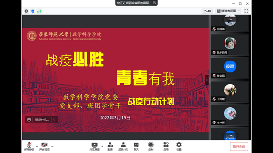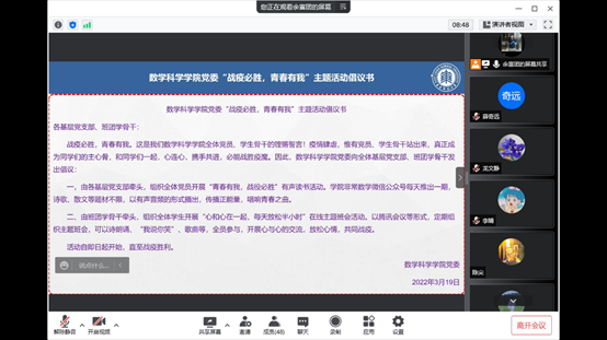 一封倡议书。战疫必胜,青春有我,成人视频 全体党员、学生骨干在关键时刻发出铿锵誓言!3月19日,成人视频 “战疫必胜,青春有我”主题活动启动。一是由各基层党支部牵头,组织全体党员开展“青春有我,战役必胜”有声读书活动。学院非常数学微信公众号每天推出一期,以有声音频,传播正能量,唱响青春之曲。二是班团学骨干牵头,组织全体学生开展“心和心在一起,每天放松半小时”在线主题班会活动。以腾讯会议等形式,定期组织主题班会,开展心与心的交流,放松心情,共同战疫。