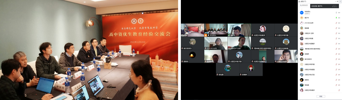11月19日,华东师大成人视频 基础数学党支部联合华二附中、太原市第五中学举行了高中资优生教育经验交流座谈会。华东师大成人视频 副院长兼基础数学党支部书记罗栗、副院长程涛、党委副书记余富团、2018年国际奥林匹克数学竞赛中国国家队领队瞿振华及支部部分党员,华东师大二附中中国数学奥林匹克高级教练、副校长施洪亮、全国化学奥林匹克竞赛金牌教练熊宗齐、全国青少年信息学奥林匹克竞赛金牌教练郭威,太原五中副校长刘晓瑜、副校长李杰及数学、化学、信息、物理部分教师代表参加活动。活动由基础数学党支部书记罗栗主持。
