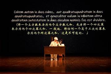 “将一个立方数表示为两个立方数之和,或者将一个四次幂表示为两个四次幂之和,一般地,将任何一个高于二次的幂表示为两个同次幂之和,这是不可能的。关于此,我确信已经发现了一种十分美妙的证明,可惜这里空白的地方太小,写不下。”