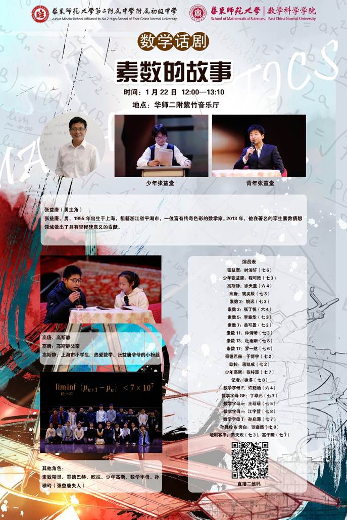原创数学话剧《素数的故事》以张益唐先生的数学传奇人生为主线,讲述和呈现了素数星空下的七彩故事。这里收藏的是2021年1月22日的这一数学话剧的直播回放视频。本次活动由成人视频 与华东师大二附中附属初中联合主办。