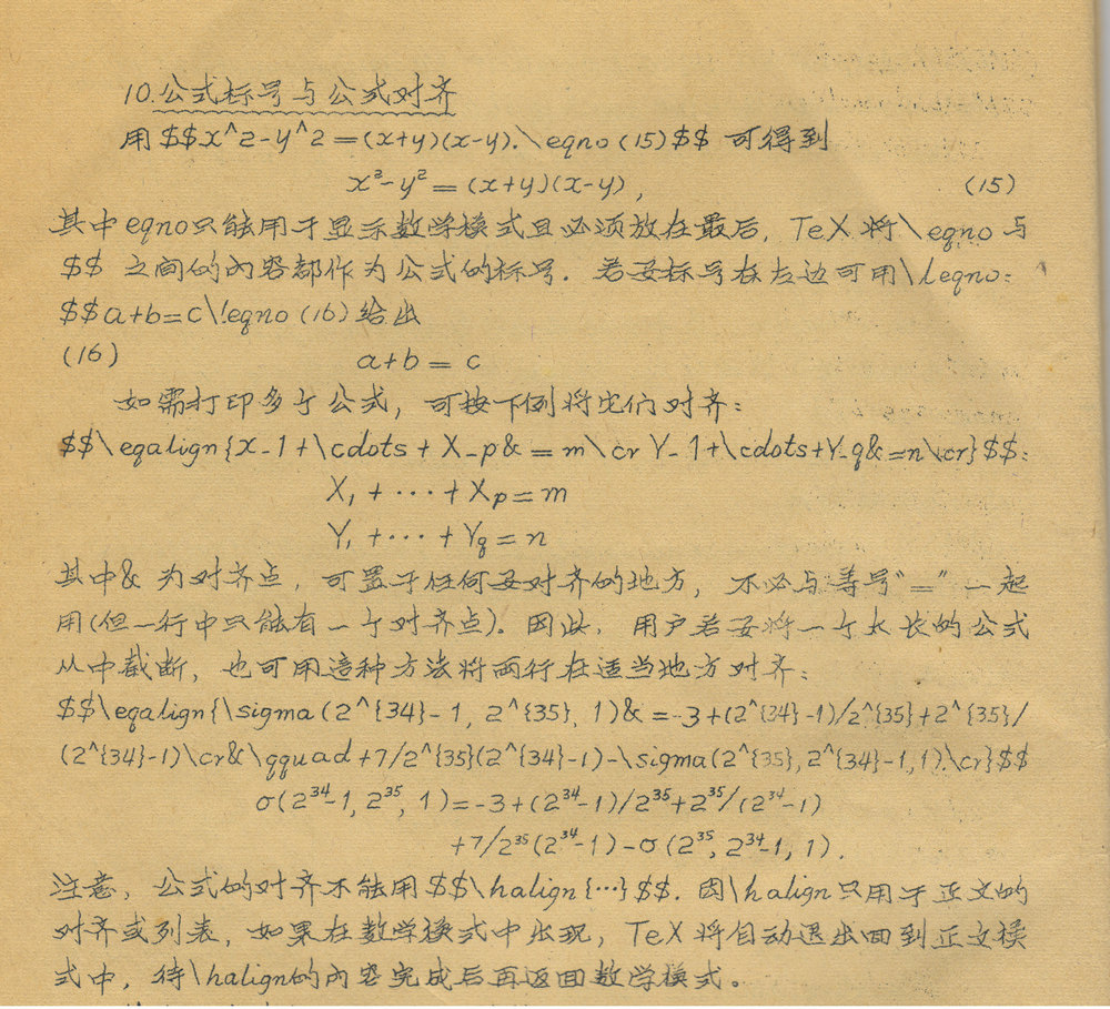 乔老师的一手好字在数学系可是出了名的,以工整为特色。所以,系里很多讲义的刻写出自他之手,确实与打字有得一拼。因为数学讲义有很多数学符号,公式不少是三四层的叠式, 机械打字的确不易,手写倒有其优势。最有意思的是,一本有关电脑排版的《PCTeX使用手册》是他刻写的,我还保存着这份资料。
