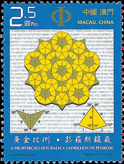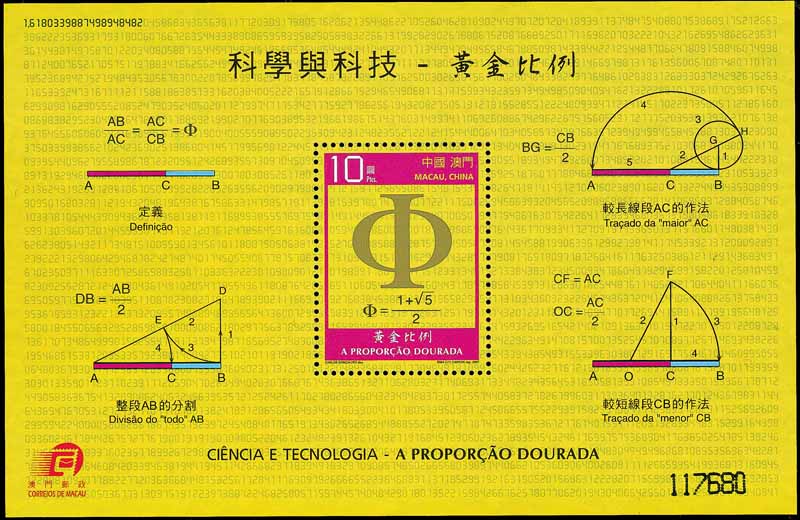 2007年10月26日澳门发行了“科学与技术 — 黄金比例”的一套邮票, 它包含一枚小型张(图1)和四枚邮票(图2, 另3枚另文介绍). 所谓黄金分割(或黄金比例)是说: 若点C将线段AB外分或内分为两部AC和BC, 使AC2=AB·BC, 这样的分割称为黄金分割. 如果将上述等式改写成AB/AC=AC/BC, 则称它为黄金比例(见图1四周各图). 如果设AB=a, 当C外分线段AB时, 可求得AC=(1+√5)/2a, 无理数(1+√5)/2常用Φ表示(见图1中间的邮票, 此小型张背景图则列出数值Φ小数点后4374位数字, 本套邮票的其他各枚也有同样的背景), 常用的近似值为1.618. 若C是内分线段AB, 则有AC=a/Φ. 1/Φ的常用近似值是0.618, 称为黄金分割数(或黄金数). 线段的这种分割从古希腊开始就被人们视作“贵比黄金”, 这就是黄金分割名称的由来.