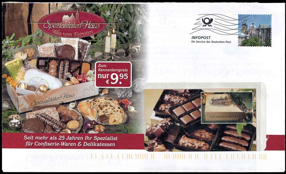 在出现货币的同时,每一种商品或者服务也都有它的价值,这种价值通过数字来表示它的价格。图4是德国商品广告邮资封,它标明面包,糖果的价格是9.95欧元(€)。图5这枚中国邮票的面值是1.60元, 图6标明美国此项小本票的出售价格为6.60美元($)。图7是日本小本票,它除了在小本票的封面(图7右面)上标明价格为100日元外,在小本票的封底(图7左面)还罗列出日本邮政各项服务应付的邮资。