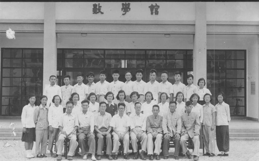 1955年暑期,数学系自己培养的首届四年制本科生毕业了,他们在数学馆门前摄影留念。同时毕业的还有两年制的数学分析研究生班和两年制的数学专科班。
